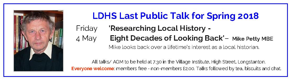 The heritage society is delighted to welcome Mike Petty back to Longstanton so he can give us a talk on ‘Looking Back over 8 decades. Mike’s contribution to local historical knowledge is probably unsurpassed in the Cambridgeshire region. Whether you are a long term resident of the area or some one who has recently moved in please do come along for what will be an informative and most enjoyable evening.