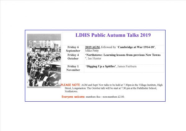 THE LDHS AGM AND THE FIRST TALK OF THE AUTUMN SEASON TAKES PLACE ON FRIDAY 6 SEPTEMBER AT THE VILLAGE INSTITUTE, HIGH STREET, LONGSTANTON. The talk will commence at 8 pm or shortly afterwards so non-members can arrive after the AGM if they wish. Please note that the October talk will be presented by Ian Hunter and will cover Northstowe and what can be learnt from previous new towns and the Garden City Movement. This talk will take place at the Pathfinder School, Northstowe phase 1. There is a charge of £ 2 per person for non-members. Refreshments are served afterwards.